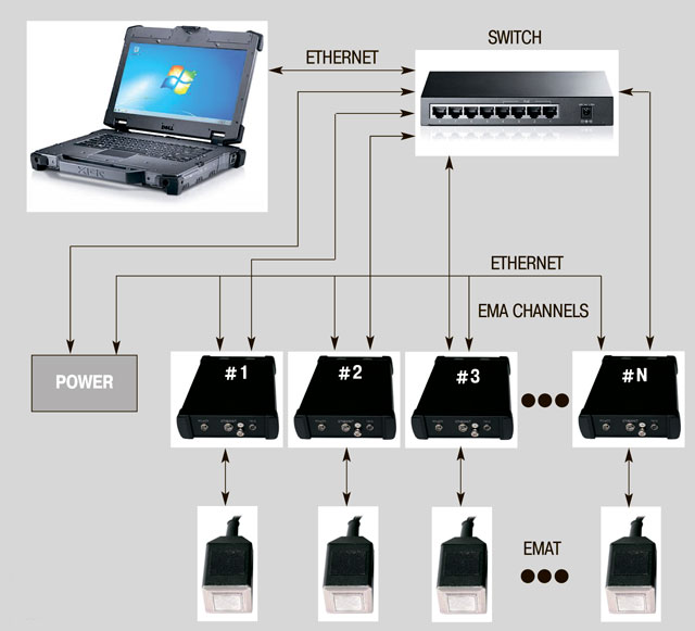 Due to the flaw detector is designed in a form of a standalone device with the connection to the PC via Ethernet port, several EMA channels can be connected to the PC via Switch unit. This allows to create EMA multi-channel testing systems.