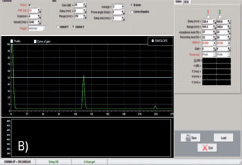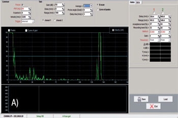 А) detection of flat-bottom hole with dia. 2 mm at a depth 136 mm (EMAT - 0o - 4 MHz, testing the 140 mm bar);B) detection of groove with a depth 0.5 mm and length 10 mm (EMAT - 45o - 2 MHz, testing the 140 mm bar).